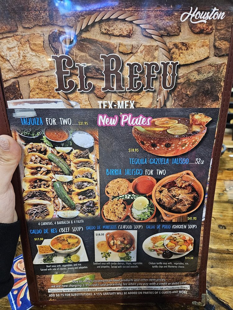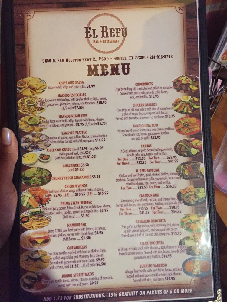 El Refu is a Tex-Mex restaurant and bar located in Humble, TX. With a casual and trendy atmosphere, it offers a variety of Mexican dishes, including botanas like Nachos Especiales and Quesadillas, tacos such as Jumbo Street Tacos and Ribeye Tacos, and wings with your choice of sauce. The menu also boasts many vegetarian options and a full bar with a range of drink selections.